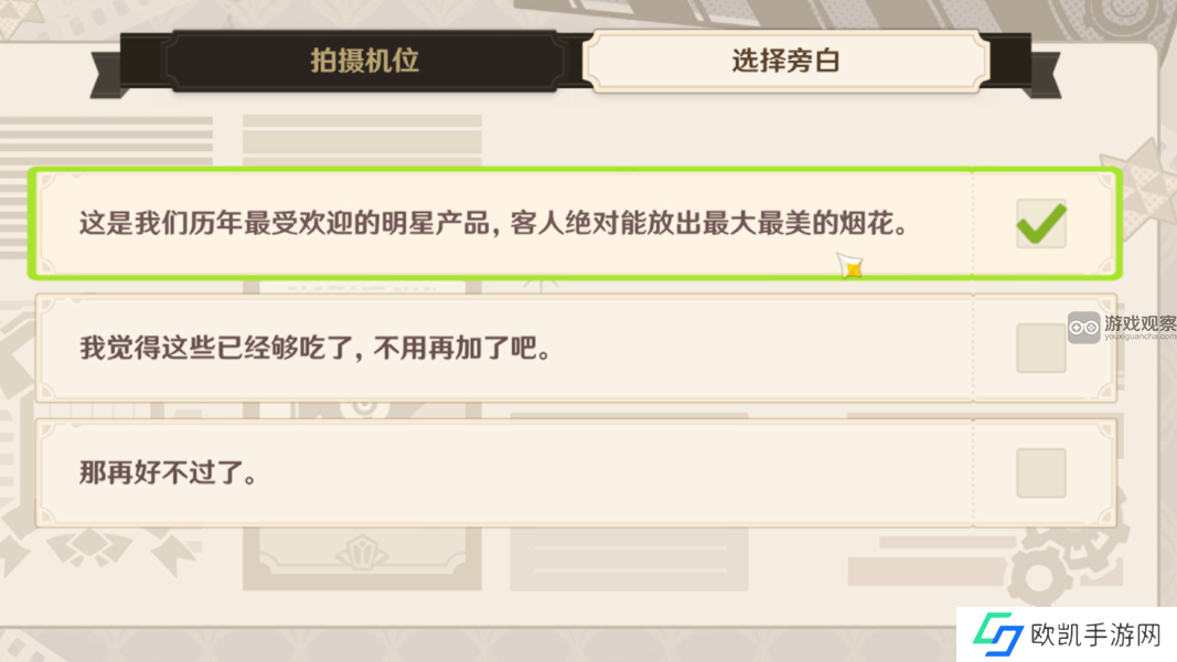 旁白需求表现烟花商(宵宫饰)与客户(里凯蒂饰)讨论销售事项的友好氛围