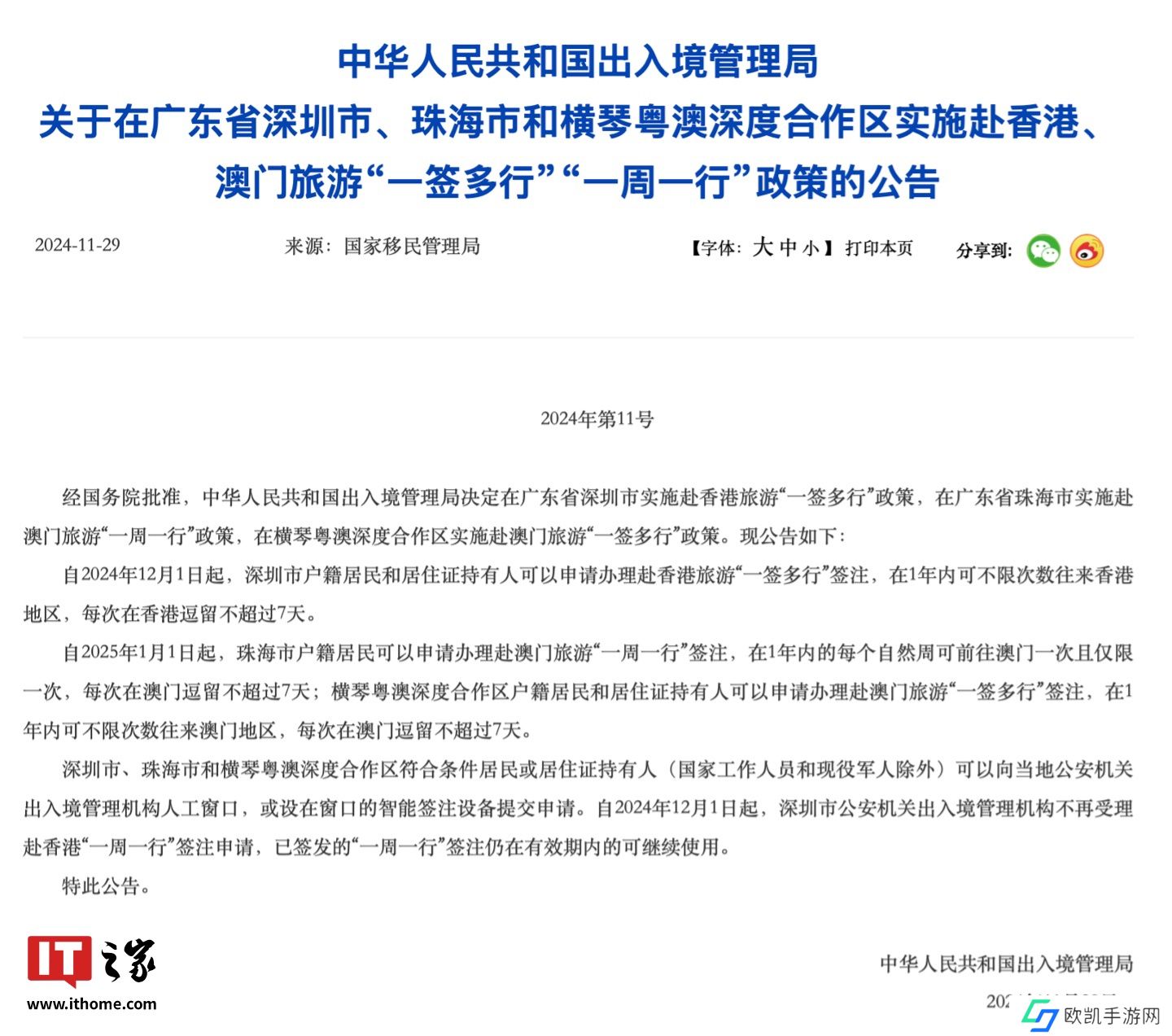 本站 11 月 29 日消息,据国家移民局网站《关于在广东省深圳市、珠海市和横琴粤澳深度合作区实施赴香港、澳门旅游“一签多行”“一周一行”政策的公告》,广东省将从12月1日起实施深圳赴香港“一签多行”、珠海赴澳门“一周一行”旅游政策。