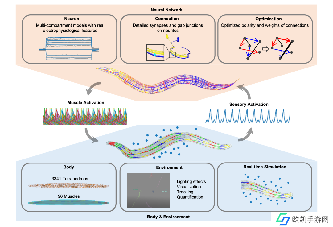 精细建模: “天宝”对秀丽线虫的 302 个神经元进行了精细建模,并模拟了 96 块肌肉和 3341 个力学计算单元,力求最大程度地还原真实线虫的身体结构和神经感知能力。