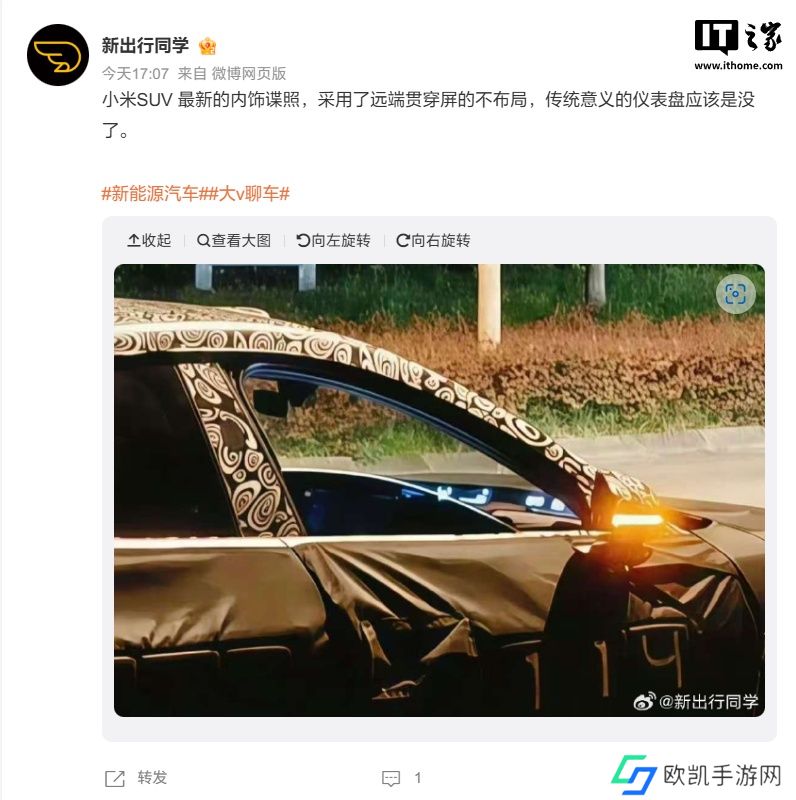 本站 11 月 29 日消息,多名博主今天曝光了一批小米 SUV 的最新谍照,这次展现的内容包含一部分新车的内饰布局。图片显示,小米 SUV 有望在仪表台前方采用远端贯穿式屏幕,造型细长酷似“带鱼屏”。
