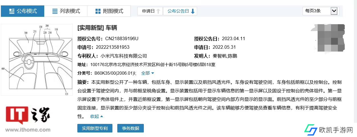 《小米汽车新专利:将显示屏设于挡风玻璃下,提高驾驶安全性》