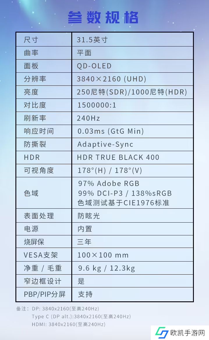 该机采用 3840x2160 分辨率240Hz三星QD-OLED面板,亮度1000尼特,动态对比度150万:1,响应速度0.03ms,支持10-Bit色彩,覆盖 138% sRGB、97% Adobe RGB以及99% DCI-P3色域。
