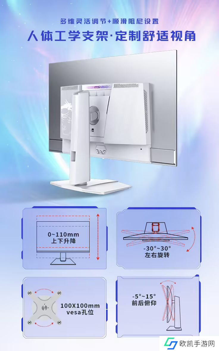这款显示器支架支持升降 / 倾斜 / 旋转,显示器本体带有RGB灯效。