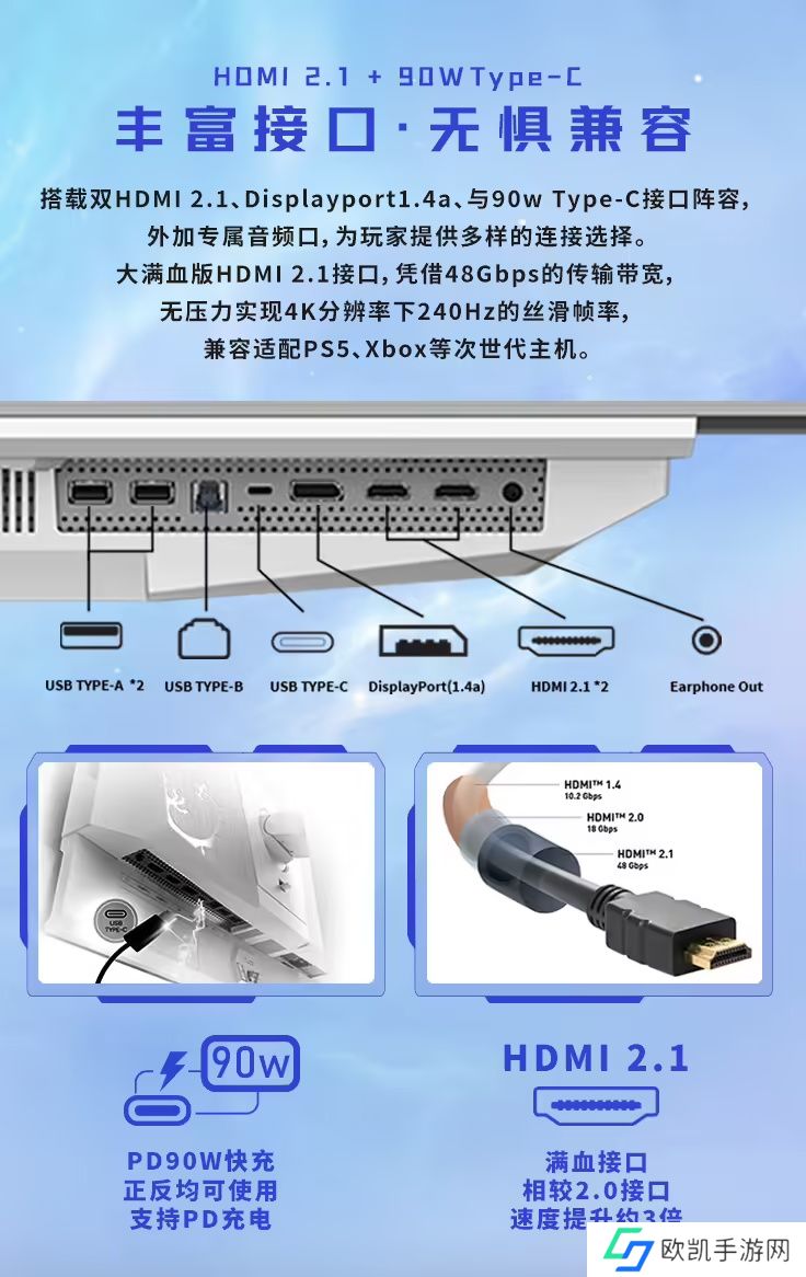 这款显示器支持VESA 100x100mm壁挂,显示器提供2个HDMI 2.1接口、1个DP 1.4a接口、2个 USB-A接口、1个 USB-B接口、1个支持 90W 供电的 USB-C接口。