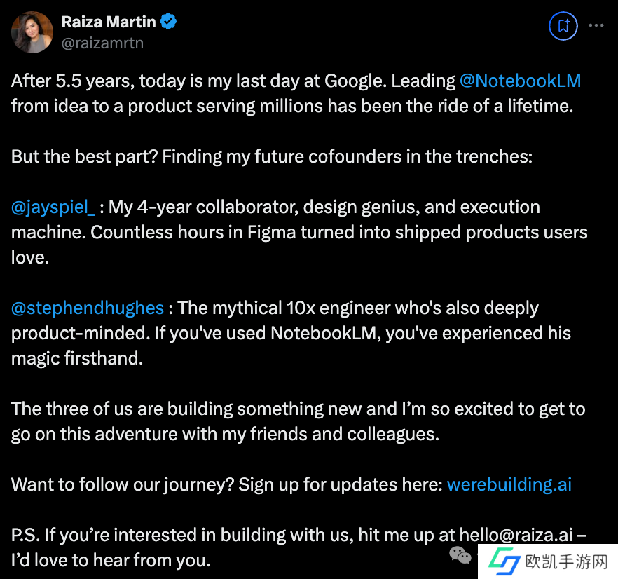 NotebookLM 还会继续更新,但此番出走的 3 位成员,基本就代表了原团队的核心:项目负责人 / 产品经理 + 设计师 + 程序员。
