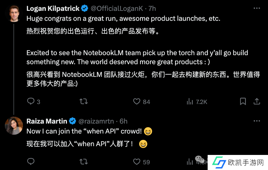 不过,在给从 OpenAI 跳槽到谷歌搞 Gemini API 的同事 Logan Kilpatrick 回复时,拉姐透露:
