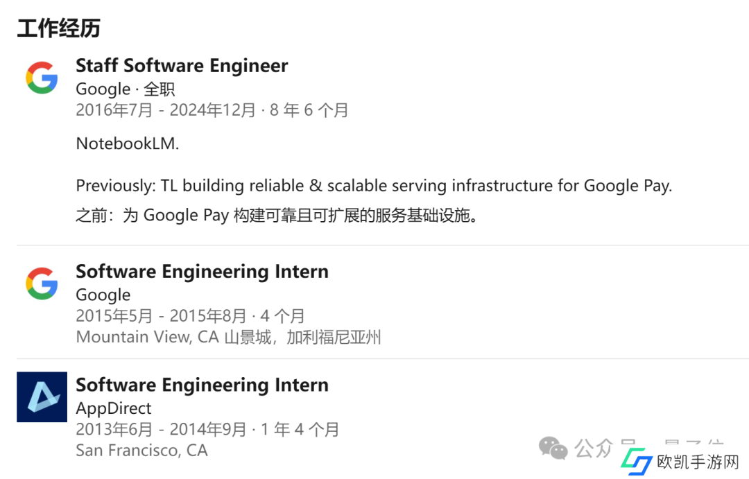 休斯全职在谷歌的时间有 8.6 年,加入 NotebookLM 团队前负责为 Google Pay 构建基础设施。