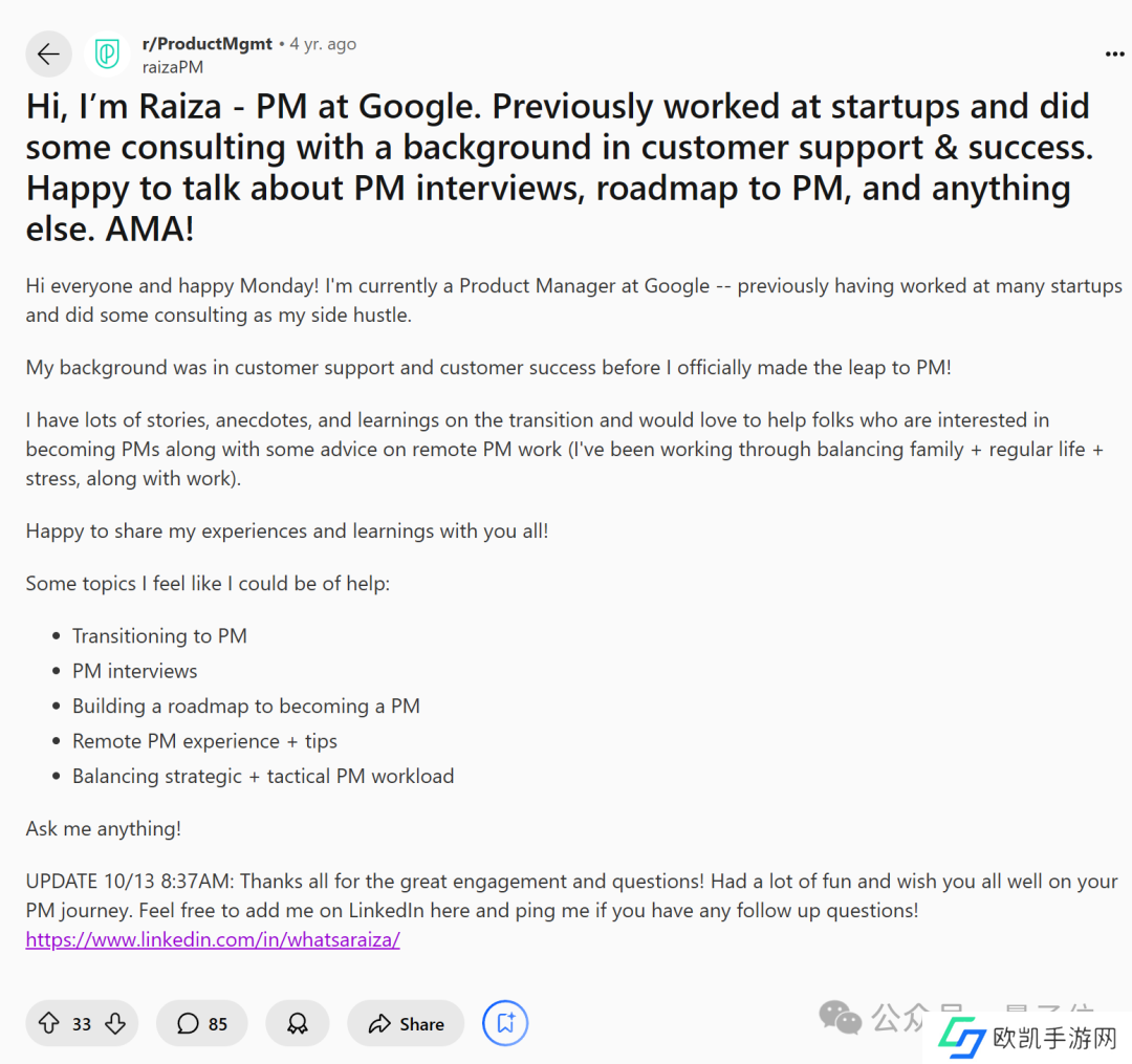 可以看出,拉姐自身拥有丰富的产品工作经验。甚至在谷歌期间,还作为特邀嘉宾分享了自己最初从客户支持到产品经理的转型之旅。
