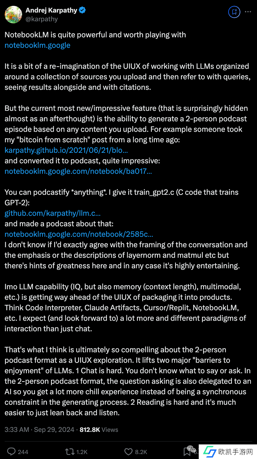 Karpathy 是这样总结其功能的:NotebookLM 消除了人们享用大模型的两大障碍: