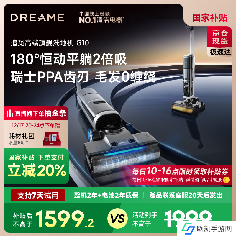 本站 12 月 17 日消息,追觅现已在京东上架一款型号为G10的洗地机,其主打“180° 躺平,零缠毛”,定价为1999元,官方称参与补贴后到手价1599元。