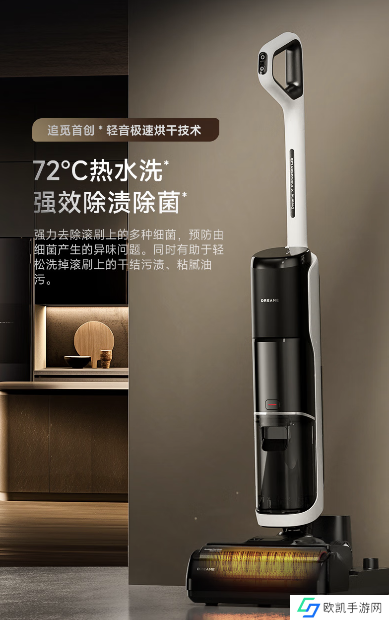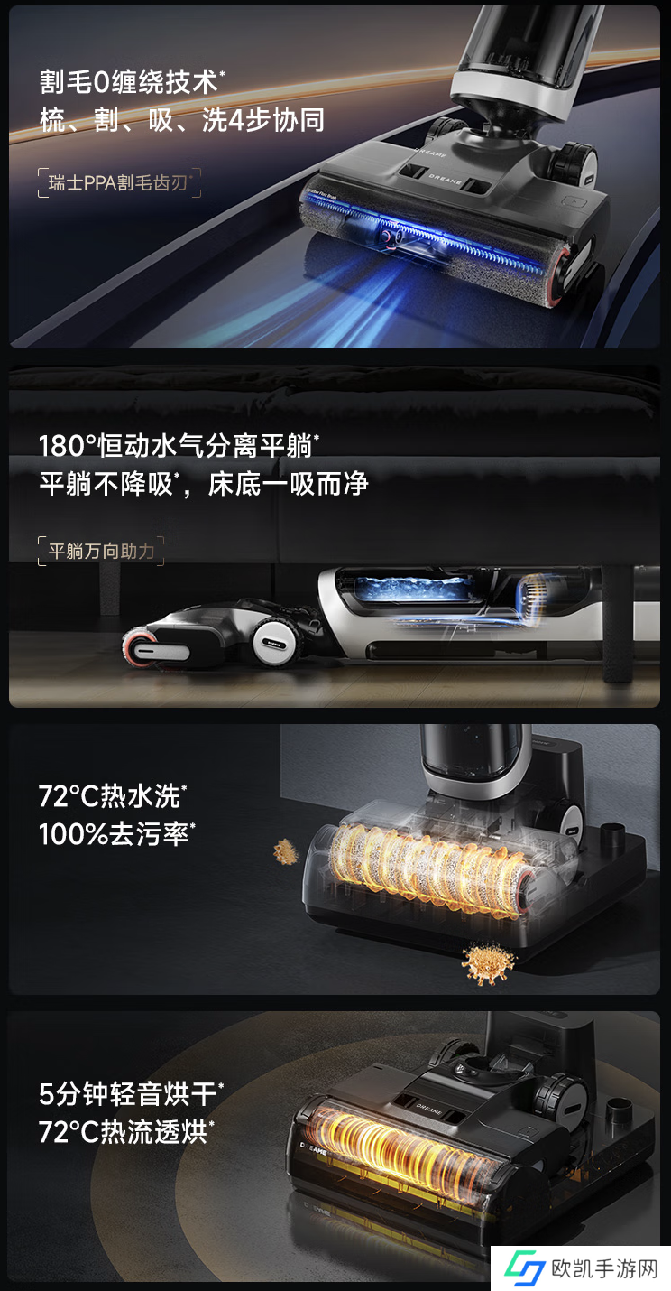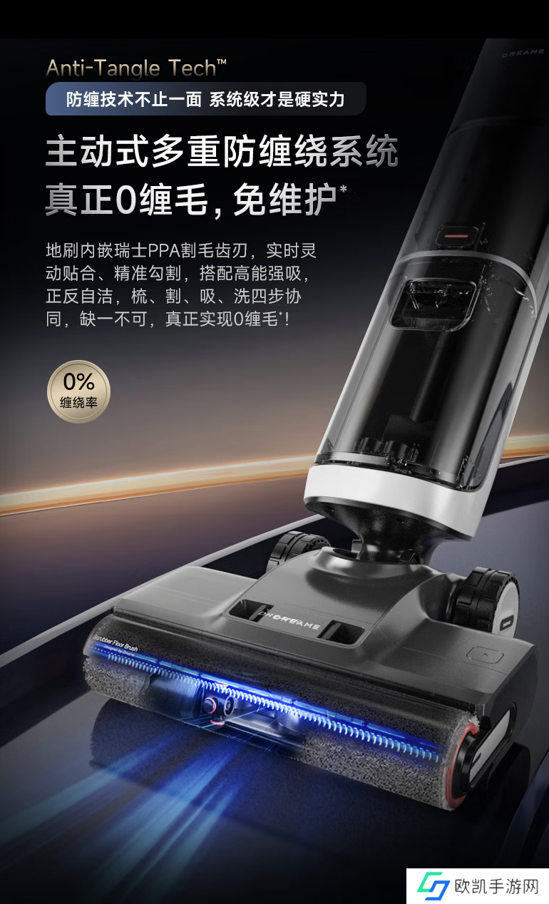 这款洗地机支持 180° 躺平,配备三向贴边刷头,搭配平躺万向轮,适合死角清洁。同时配备主动式多重防缠绕系统,可实现“零缠毛”。