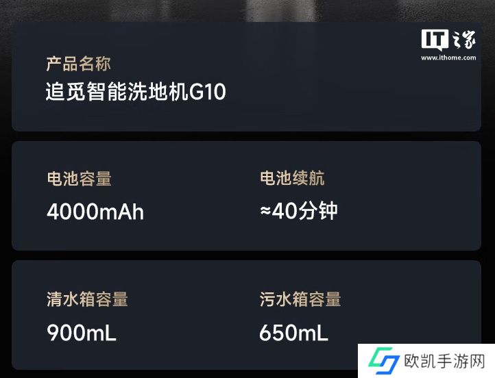 该洗地机采用了 4400 转 / 分钟电机,拥有 18000Pa 吸力,支持 72℃热水 / 电解水滚刷自清洁,机身自带“智能、除菌、吸水、自定义”四种工作模式,配备4000毫安时电池,带有 900ml 清水箱与 650ml 污水箱,最长使用续航可达 40 分钟长续航,一次满电满水最大可完成对 300㎡面积的清洁。
