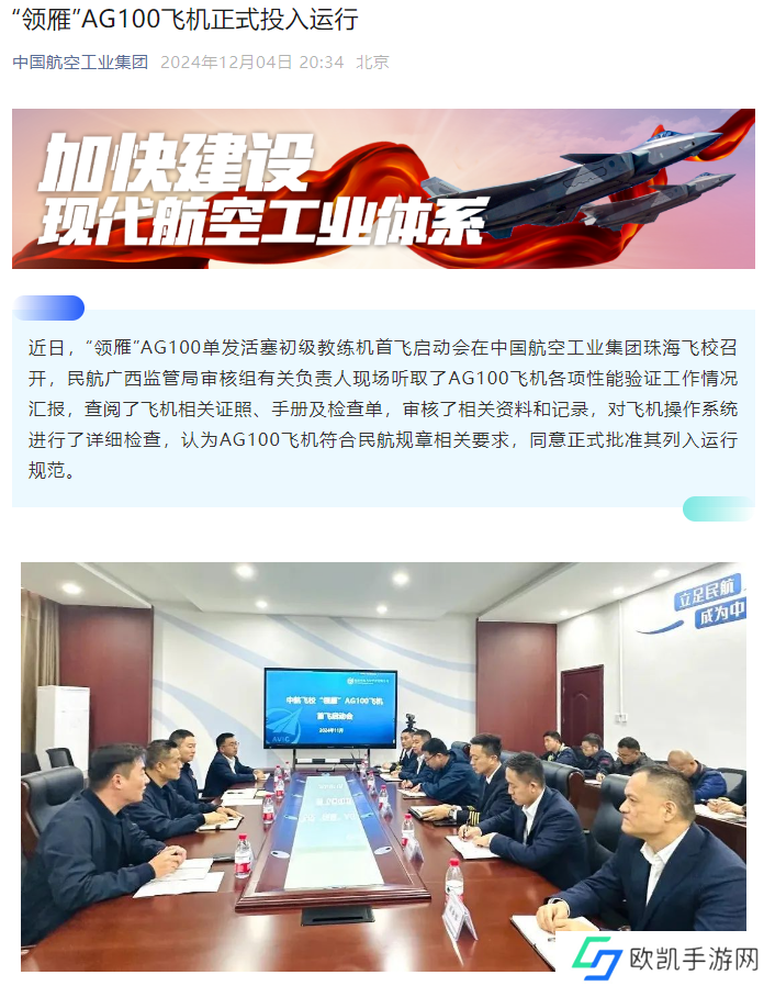 本站 12 月 4 日消息,中国航空工业集团今日宣布,国产新一代民用初级教练机“领雁”AG100 经过详细检查和认证,符合民航规章相关要求,正式批准正式投入运行。