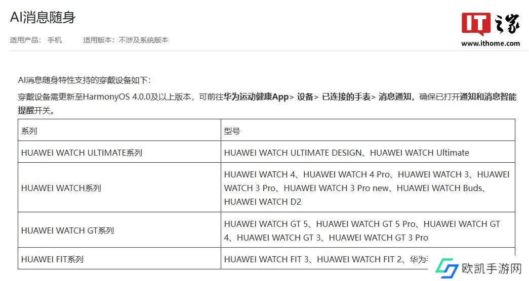 华为官网现更新了 AI 消息随身功能穿戴类设备适配情况,本站附详情如下: