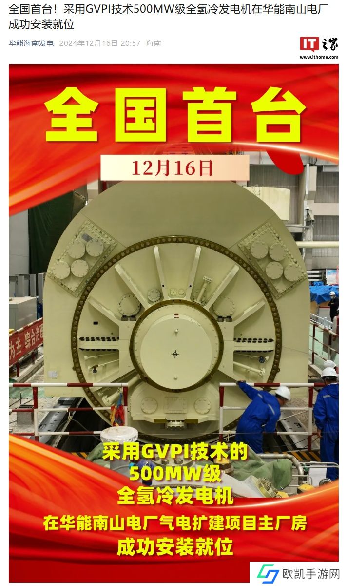 本站 12 月 16 日消息,据华能海南发电消息,全国首台采用 GVPI 技术的 500MW 级全氢冷发电机在华能南山电厂气电扩建项目主厂房成功安装就位,为项目冲刺投产目标打下基础。