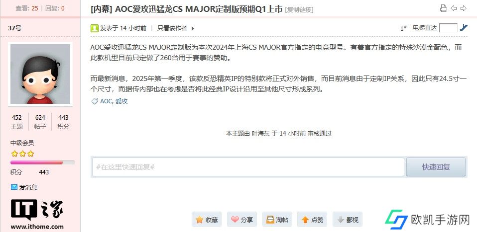 有渠道商在博板堂爆料称,在本次上海 Major 比赛中使用的显示器为 AOC 爱攻迅猛龙定制型号,这款机型目前只定做了 260 台用于赛事的赞助,但 AOC 突然又想在明年将其推向消费市场。