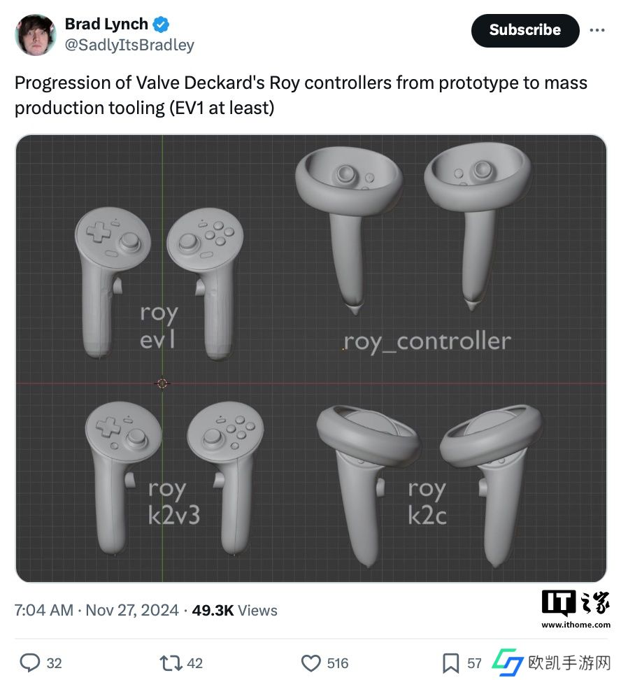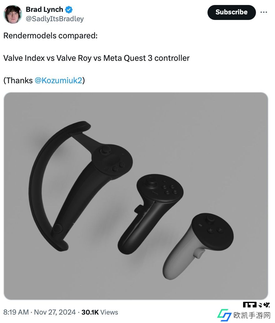 本站 12 月 1 日消息,数据挖掘者Brad Lynch在V社最新的Steam VR软件包中发现了新款头显的代码应用及对应控制器手柄“Roy”的 3D模型。