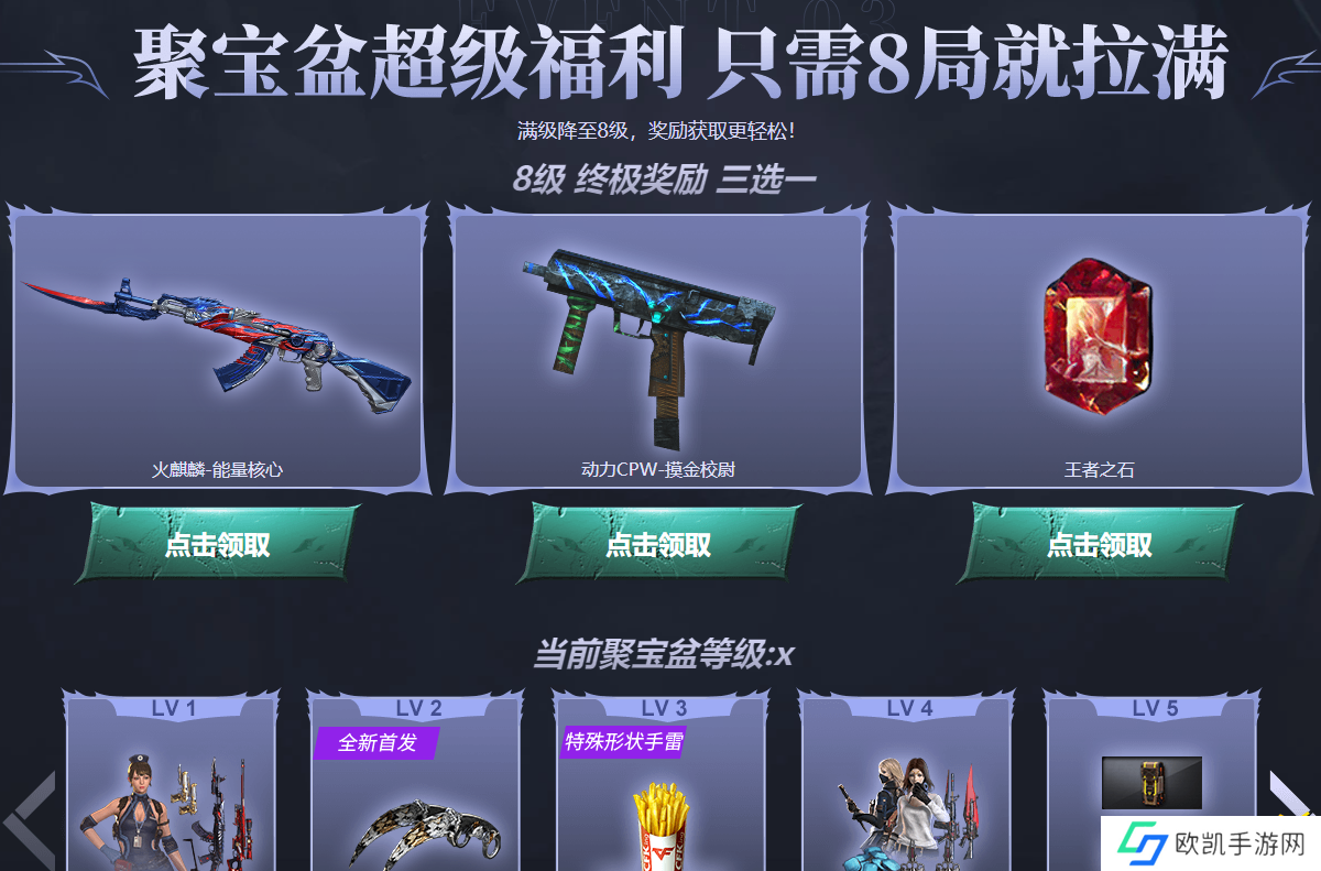 4月福利聚宝盆,只需8局就能拉满,满级降至8级,奖励获取更轻松。当玩家聚宝盆等级达到8级时,即可在火麒麟-能量核心、动力CPW-摸金校尉、王者之石*1中任选其一获得,玩家每天可通过游戏一局、通过平台任务、掌火签到等任务来升级。