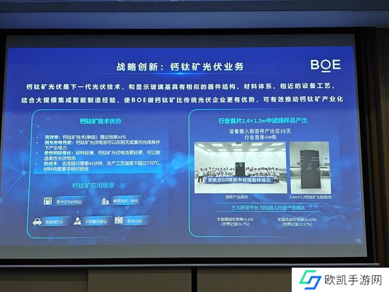 战略向新:自2021年“屏之物联”战略重磅发布以来,BOE(京东方)又于2024年京东方全球创新伙伴大会(BOE IPC·2024)上发布了基于“屏之物联”战略升维的“第N曲线”理论,以半导体显示技术、玻璃基加工、大规模集成智能制造三大核心优势为基础,精准布局玻璃基封装、钙钛矿光伏器件等前沿新兴领域,全力塑造业务增长新赛道。目前,玻璃基封装领域,BOE(京东方)已布局试验线,成立了玻璃基先进封装项目组,实现样机产出;钙钛矿领域,仅用38天就已成功产出行业首片2.4×1.2m中试线样品,标志着钙钛矿产业化迈出了重要一步。