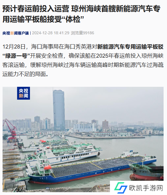 本站 12 月 28 日消息,据央视新闻报道,今日,海口海事局在海口秀英港对新能源汽车专用运输平板驳“绿源一号”开展安全检查,确保该船在 2025 年春运前投入琼州海峡客滚运输,缓解琼州海峡过海车辆运输高峰时期新能源汽车过海疏运能力不足的局面。