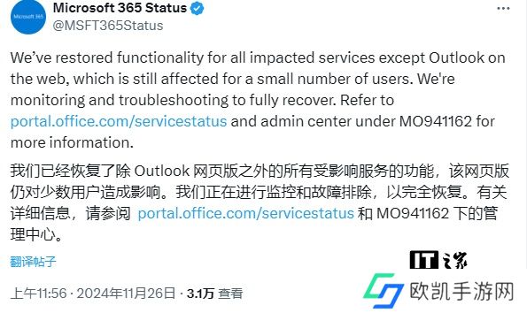 微软官方表示,此次故障是由最近对 Exchange Online 和 Teams 日历进行的更改引起的,导致了功能问题。尽管修复工作已覆盖约 98% 的用户,但恢复速度比预期慢。微软于周二更新称,“除网络版 Outlook 外,所有受影响服务的正常功能均已恢复,网络版 Outlook 仍有少数用户受到影响。我们正在监控和排查,以完全恢复到正常状态。”