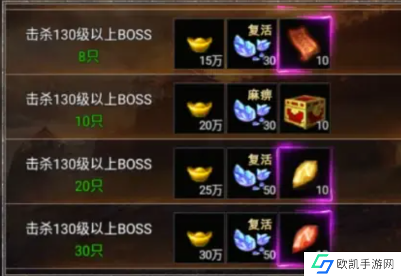 而要获得这些奖励,只需击败两只130级以上的BOSS。而终极奖励则更加丰厚,需击败30只130级以上的BOSS。这样做可获得30个金饺子、50个复活特戒碎片以及10个离火精华。离火精华可用于提升“四象仙宝”中的八卦炉等级,从而大幅提升玩家的战斗力。
