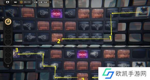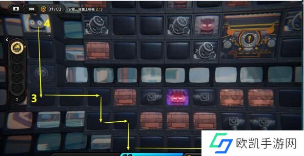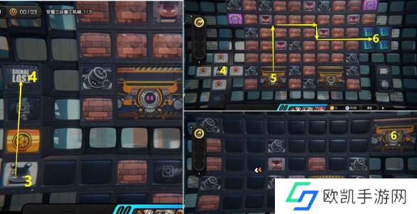 3、接着去4区域,4区域上下左右4个控制机关,可以控制5机械移动,将5机械按照下图路线,移动到6区域即可