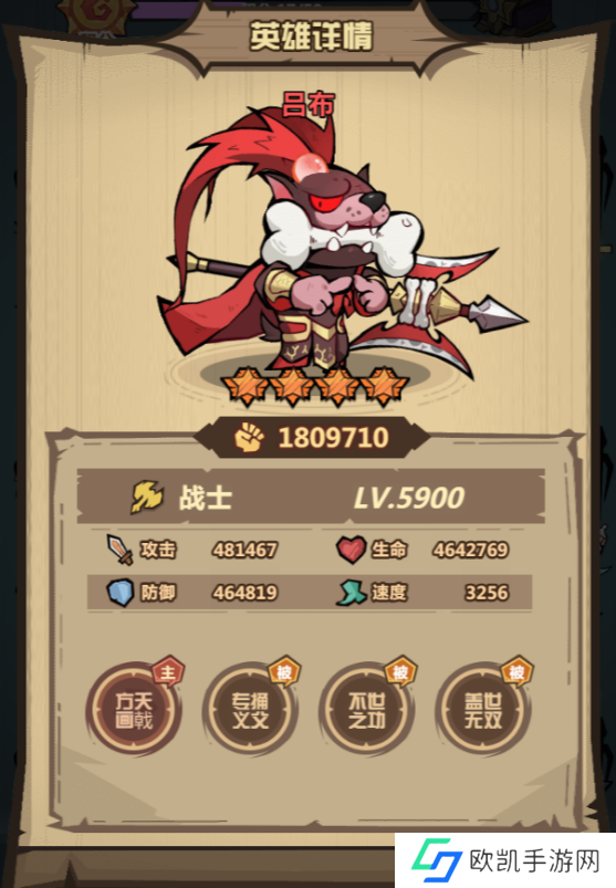 吕布作为主将,其自身被动护盾效果已经额外强悍,再加上主动技能「方天画戟」的真实伤害和暴击效果,可以说是竞技场战斗里的中流砥柱。吕布的站场输出能力在峡谷中数一数二,但缺乏持久的续航。在阵容中若搭配可复活队友的太乙真人,或是具有恢复队友生命值的蔡文姬,能让其实力更上一层楼。