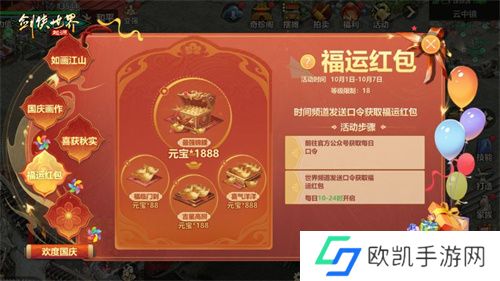 国庆7日假期期间,《剑侠世界:起源》为大侠们准备福运红包大放送。每位玩家都可以通过参与活动获得“福运红包”。发送正确的口令至世界频道,即可获得包含元宝的红包。每日口令将通过官方微信公众号发布,记得每日关注,不要错过任何惊喜哦!让福运和元宝伴您度过一个难忘的假期!