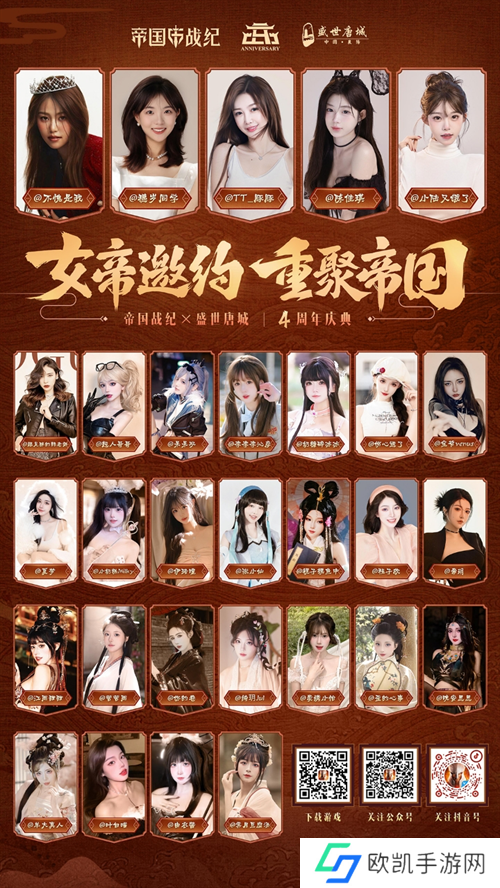 作为《帝国战纪》的前哨,小编快马来报,《帝国战纪》四周年将沿袭三周年国风古韵,携手武皇则天、千万国风佳人在襄阳盛世唐城举办以“女帝邀约.重聚帝国”为主题的大型庆典,为玩家们带来两大惊喜、三大盛举再掀国风盛宴。如非遗手指画大师现场创作史诗级巨作、多场大型主题活动……