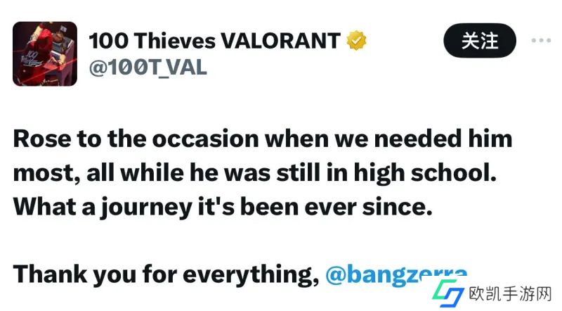 100 Thieves战队通过官方社交媒体宣布,选手bang从无畏契约阵容正式离队。战队特别感谢bang在关键时刻的贡献,尤其是他在高中时期便加入队伍,展现出极高的竞技天赋。