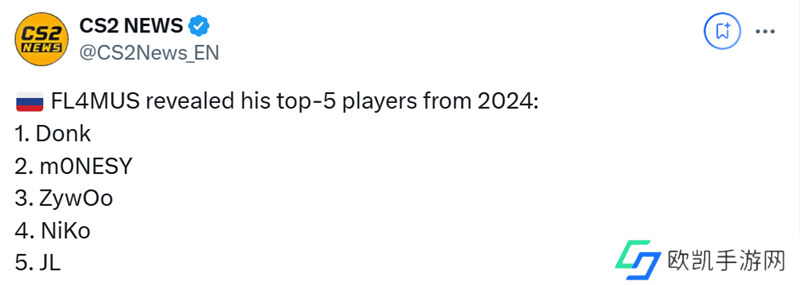 GamerLegion战队选手FL4MUS在社交媒体平台上分享了自己的2024年度Top5选手预测: