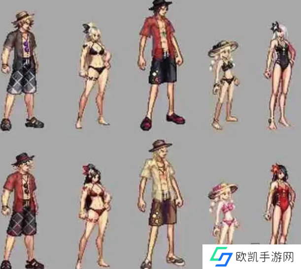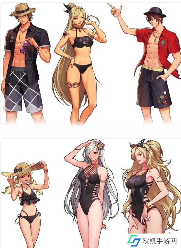 由8件高级时装+1件高级皮肤组成,属性和导师套一样,男角色主打“沙滩裤造型”、女角色主打“比基尼造型”
