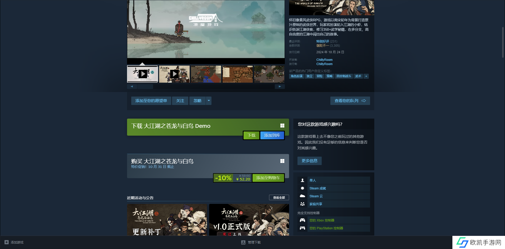 《大江湖之苍龙与白鸟》在Steam平台只有标准版,售卖价格分别是人民币58元,目前有价格优惠,价格为52.2元。