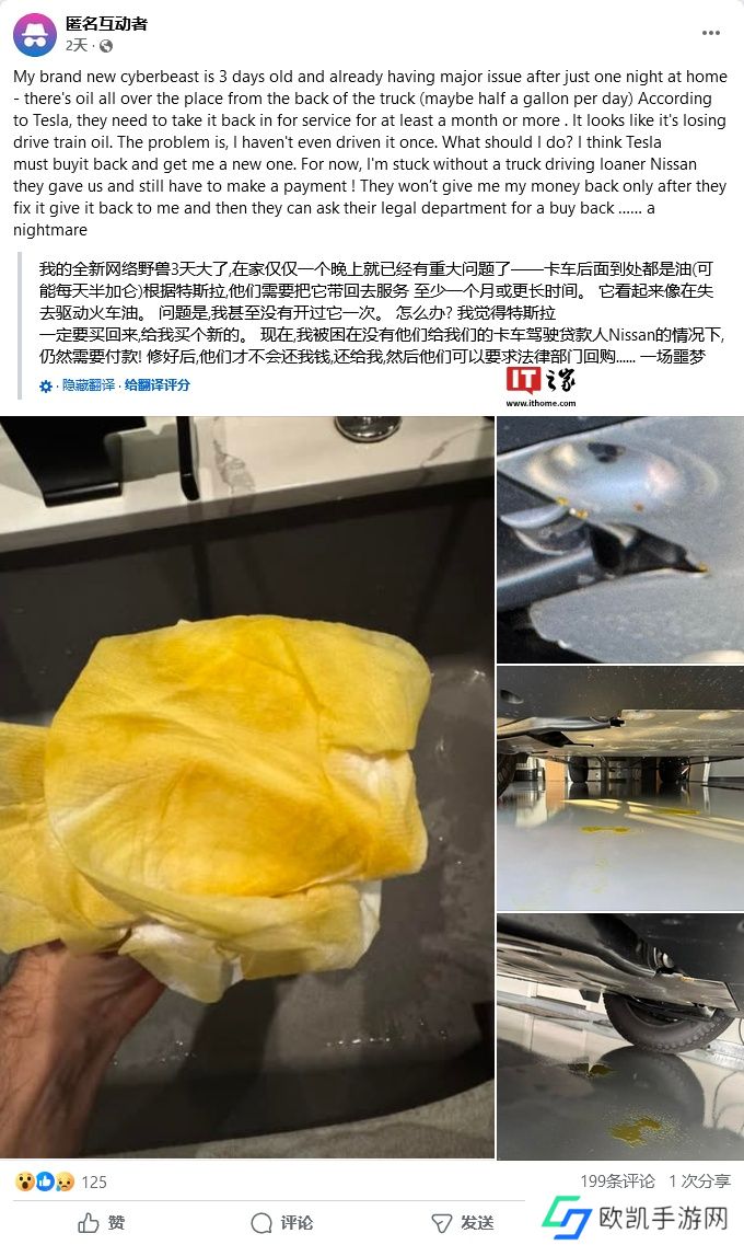 本站 12 月 25 日消息,匿名车主于 2 天前在 Facebook 上发帖,反馈特斯拉 Cybertruck 提车不到 3 天,就出现了严重的漏油问题,每天泄漏量约半加仑(本站注:约 1.9 升),特斯拉经销商表示,维修需要至少一个月时间。