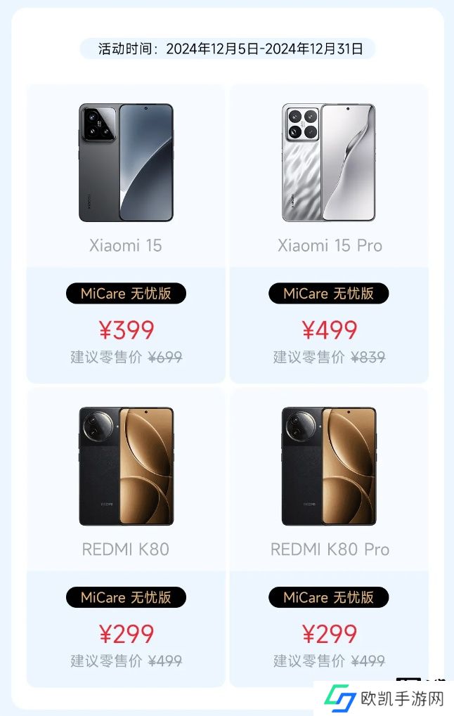 本站 12 月 12 日消息,小米服务公众号今日发文,Xiaomi 15 系列、REDMI K80 系列 MiCare 无忧版享 6 折优惠,活动时间为 2024 年 12 月 5 日-2024 年 12 月 31 日。