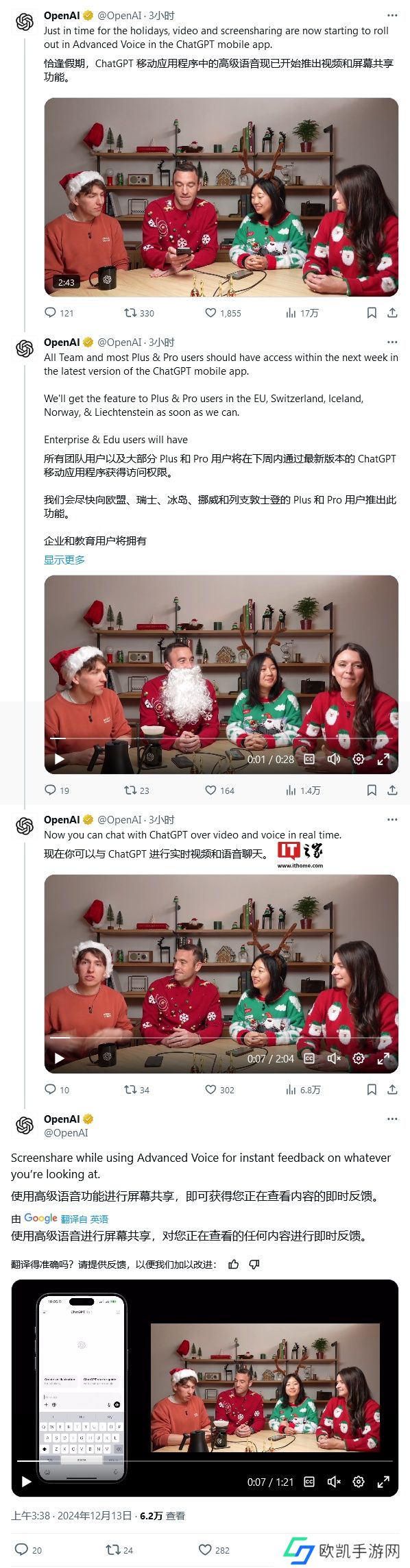 OpenAI 公司表示未来几天时间内,会向大多数 ChatGPT Plus 和 Pro 用户以及所有 Team 用户,推出视频和屏幕共享。该聊天机器人的企业和教育用户将在 1 月份获得视频和屏幕共享功能。