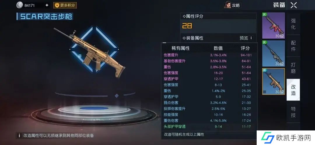 2、每件装备在打造完成后,都会随机生成一些属性,也就是俗称的“词条”,武器和护甲有着不同的属性加成。游戏中有三种品质的属性加成,从高到低分别为紫色、蓝色、绿色,属性品质越高,属性加成也就越高,所加成的评分也就越多。当幸存者们对当前装备的属性不满意,即可使用热塑镀膜进行改造,每次改造的后的属性为随机生成,幸存者们可以选择保留或覆盖原属性。