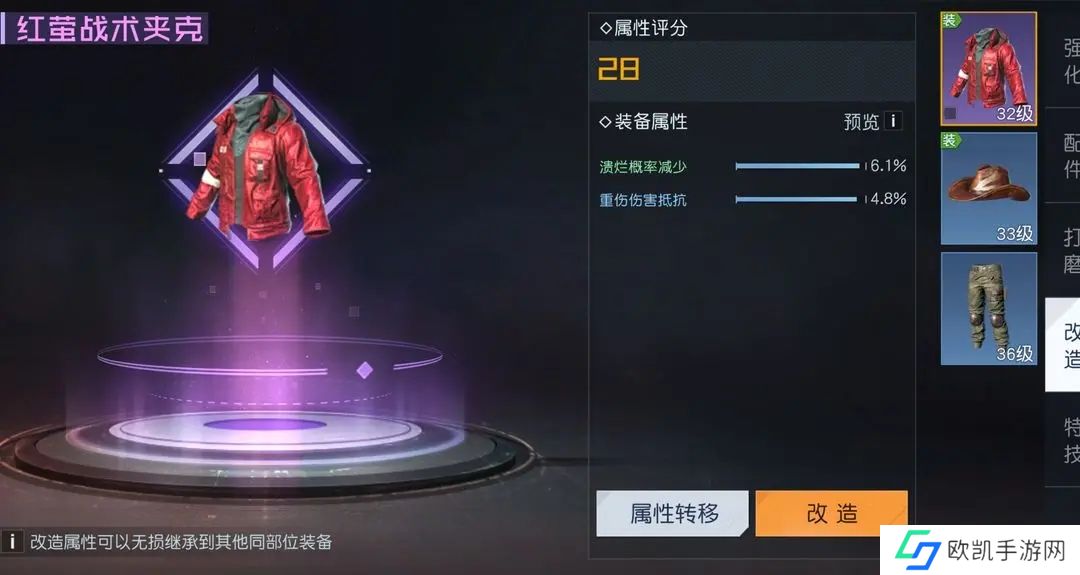 1、改造系统在30级时开启,因此只有30级或以上的装备才可进行改造,每次进行改造都需要消耗5个热塑镀膜(可用于30-49级装备改造)和500银币,当想要锁定某个属性时,则需要额外消耗1个改造合金。
