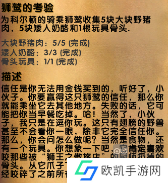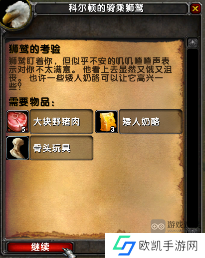 1、狮鹫的考验任务需要我们收集三种东西,分别是:骨头玩具、矮人奶酪、大块野猪肉