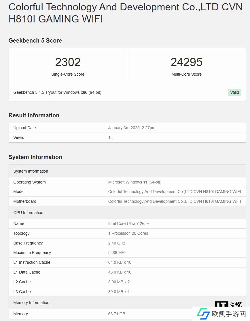 本站 1 月 3 日消息,今天有一款搭载酷睿 Ultra 7 265F 处理器的七彩虹开发测试平台出现在了 Geekbench 上,而且还是英特尔尚未发布的 H810 芯片组,从后缀“I”来看是一款 ITX 主板。