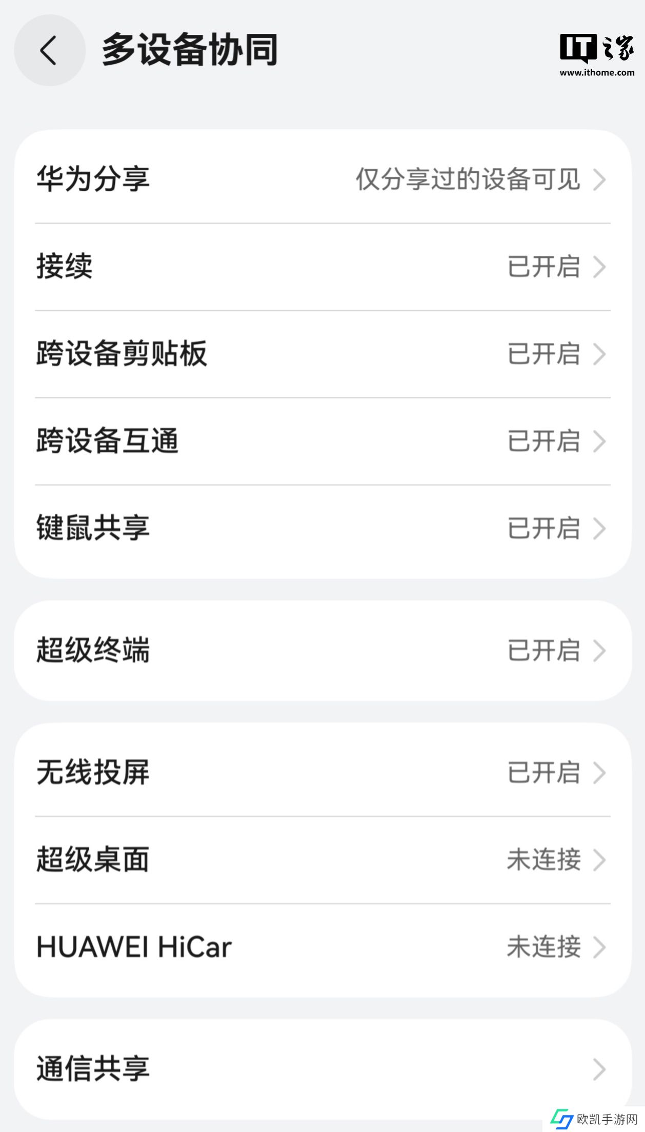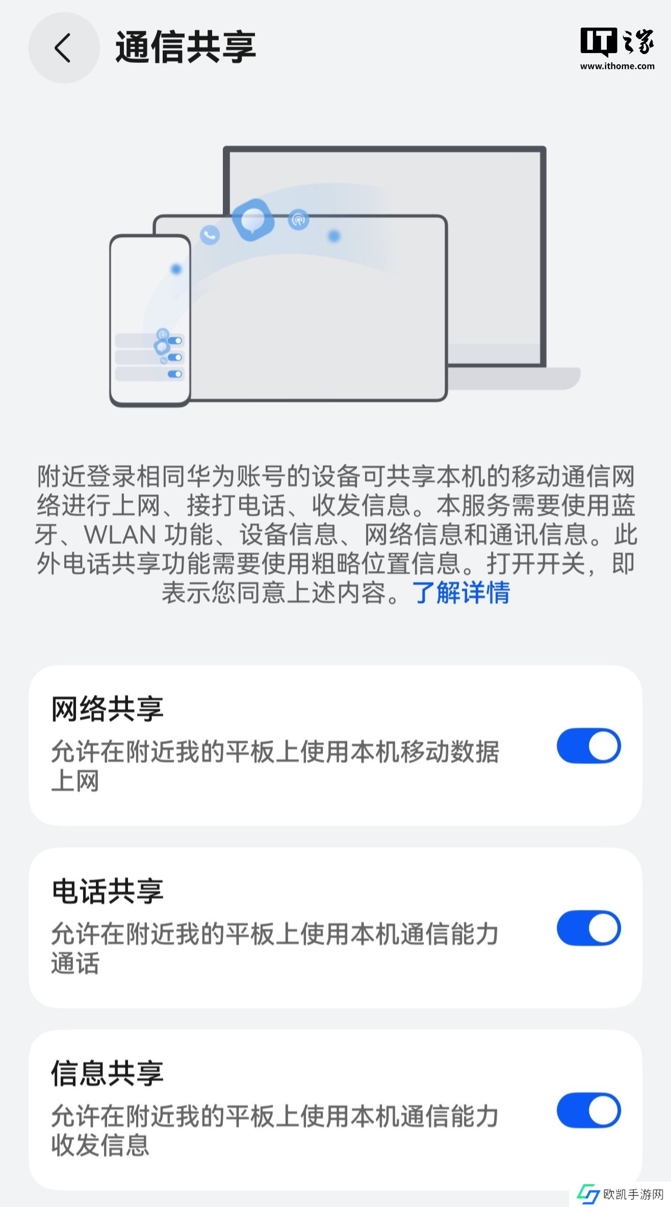 本站注:通信共享功能是华为于 2022 年在鸿蒙HarmonyOS 3.0 系统加入的设备互联功能,该功能可将手机的通信及网络能力分享给平板,开启多设备通信共享功能,附近 1 米内无通信能力的设备(如部分平板等)可借助手机的通信能力进行上网、接打电话,收发信息。