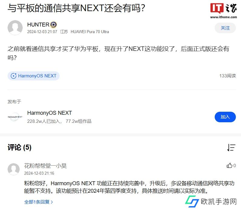 据本站此前报道,花粉帮帮堂用户小昊在本月针对通信功能的上线情况进行了解答“HarmonyOSNEXT 功能正在持续完善中,升级后,多设备移动通信网络共享功能暂不支持。该功能预计在2024 年第四季度支持,具体推送时间请以实际为准。”
