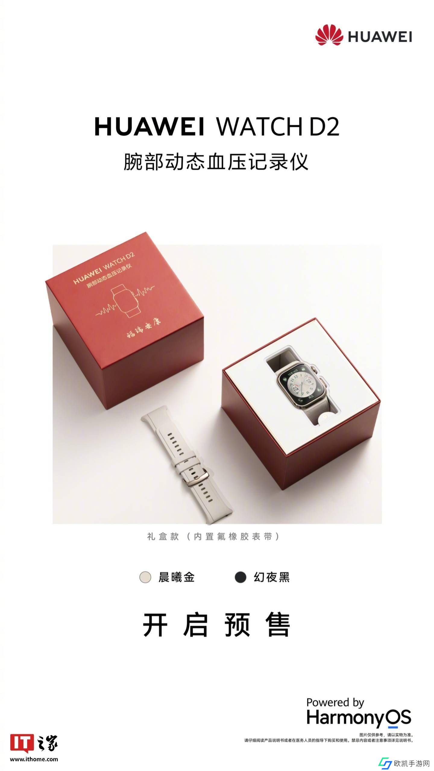 华为 WATCH D2 腕部动态血压记录仪手表拥有“幻夜黑”和“晨曦金”2 种配色。从商品页面获悉,礼盒款加送的氟橡胶表带无气囊不能用于血压测量。