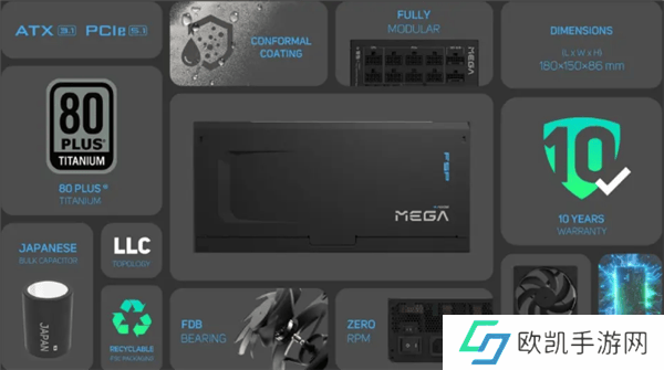 据悉,MEGA TI 1350W符合英特尔ATX 3.1 和 EPS 2.92 标准,拥有80 PLUS、Cybenetics双机构钛金转换效率认证。