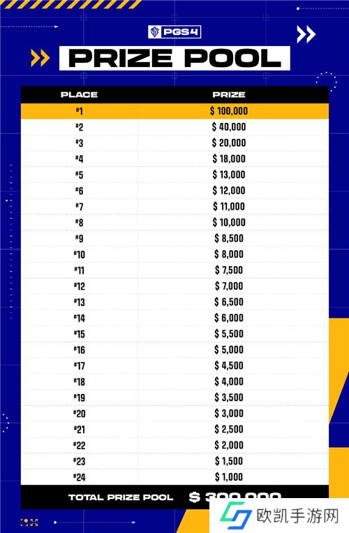 PGS 4的总奖金与PGS3一致,总奖金为30万美元,冠军将获得10万美元,从第2位到第24位的战队将获得4万美元到1000美元的奖金。