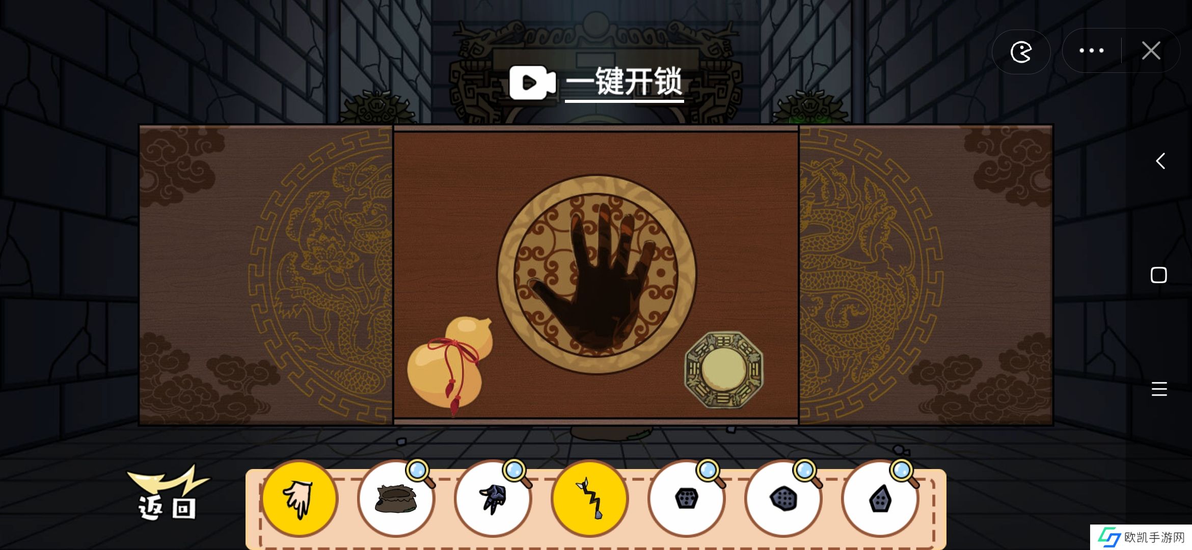 3、手甲:需要先完成匣子解谜:先把中间的龙头转正,然后转中圈,最后转外圈。完成转盘解谜后,把右下角的手拖到手印上即可获得手甲