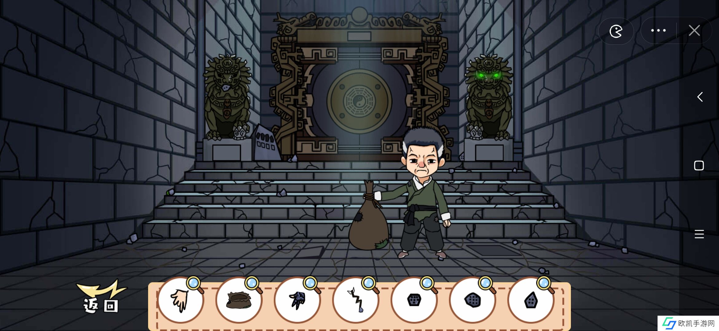 13、开封的书信:宝库开门后可以看到一颗绿色宝石,那其实是左边石狮子的眼睛,另一只眼睛在台阶上最左边的石子后面,把两个眼睛拖给左边石狮子,下方暗格会打开,书信就在里面,阅读后点击开封的书信,获得全部物品完美通关