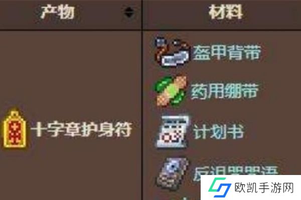 泰拉瑞亚快速获取十字护身符,首先玩家需要收集药用绷带、计划书、蒙眼布、盔甲背带、反诅咒咒语,发光墨镜,将收集到的材料放入工匠坊制作就能获得了,可以和黑曜石护盾合成十字章护盾。