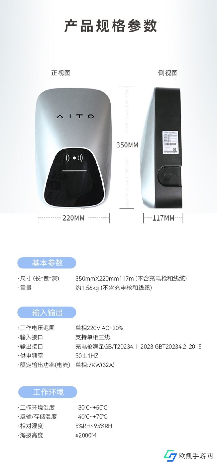据介绍,问界 2.0 PRO 家充桩支持 IP55 级防水防尘,选用人体工学原理设计的充电枪头;充电功率 7kW,适配问界系列车型,兼容符合新国标的新能源汽车。